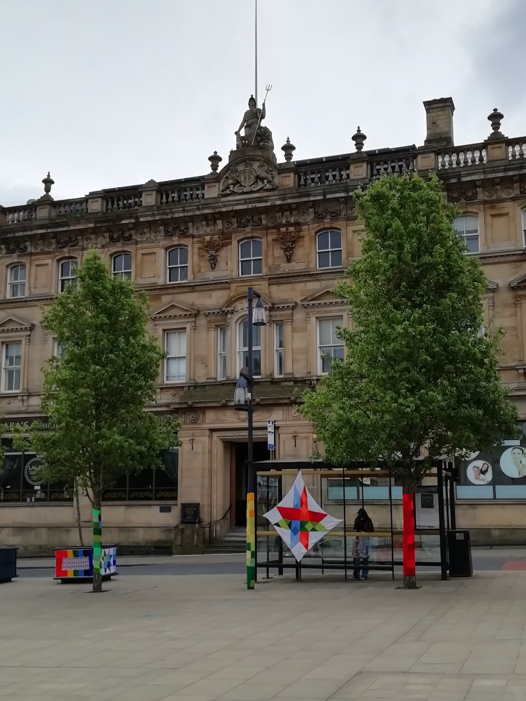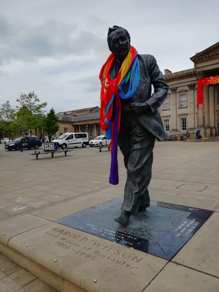 Thousands of squares knitted from all colours of the rainbow have been created by a community of knitters all over the region. Once people heard of the project via online networks (communities), contributions come in from Germany, Finland, Italy, New Zealand and Australia – from knitters eager to join this vibrant community project. I’m proud to know one of the very talented contributors, and delighted to see the founding advocate of the inspirational Open University, Harold Wilson, suitably adorned in the yarn bomb!