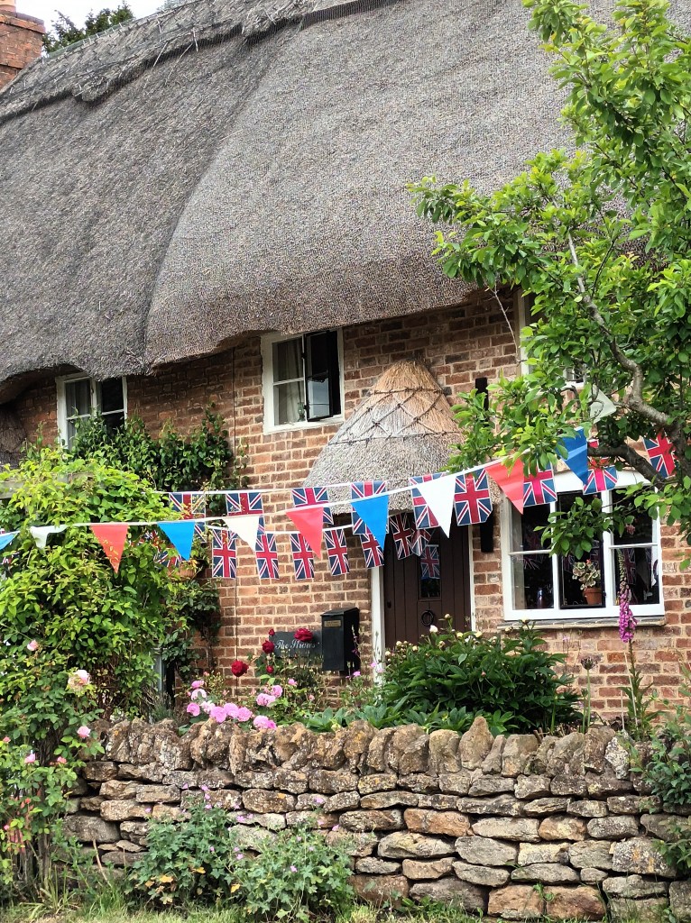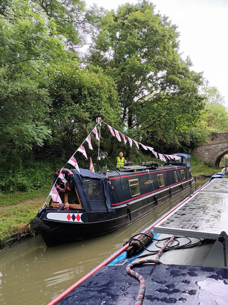From the Oxford Canal onto the Grand Union (Grand Junction Canal) and through Norton Junction onto the Leicester Line in sun and rain, we’ve seen growing evidence of celebration preparations for the Platinum Jubilee. Flags and buntings adorn houses and gardens, shops and pubs. Talk at locks is of joining family, parties and public events.