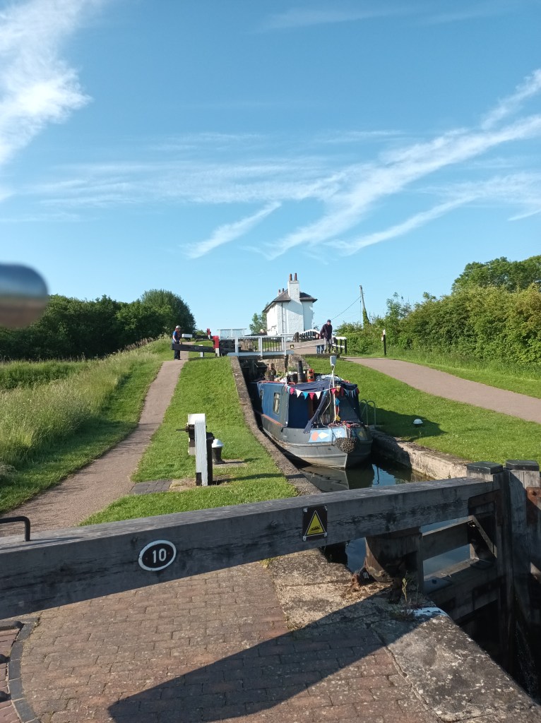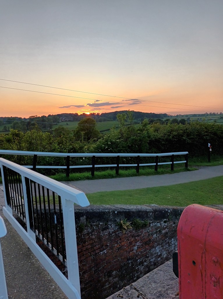 We’re happy with our boat and our lot, so we came through Crick early, although the mooring marshal was still in evidence working hard. We were down the Foxton Flight before the show even started. Our Jubilee weekend began at Foxton with a stunning sunset.