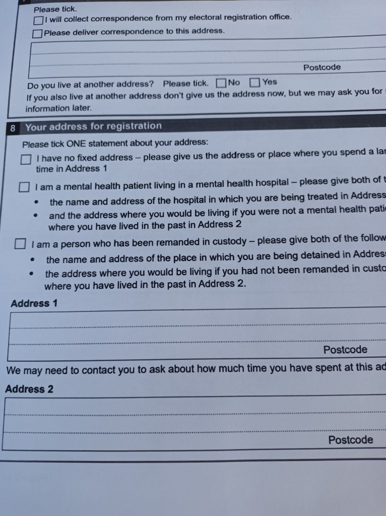 The choice: Collect from electoral registration office or give an address. We gave an address where all our post goes. Then we were asked “Do you live at another address? Yes or No…. Oh dear. We don’t live at that address but we don’t have another address so what on earth are we supposed to put there? If we lived at that address we would have a fixed address and we wouldn’t be filling in this wretched form!