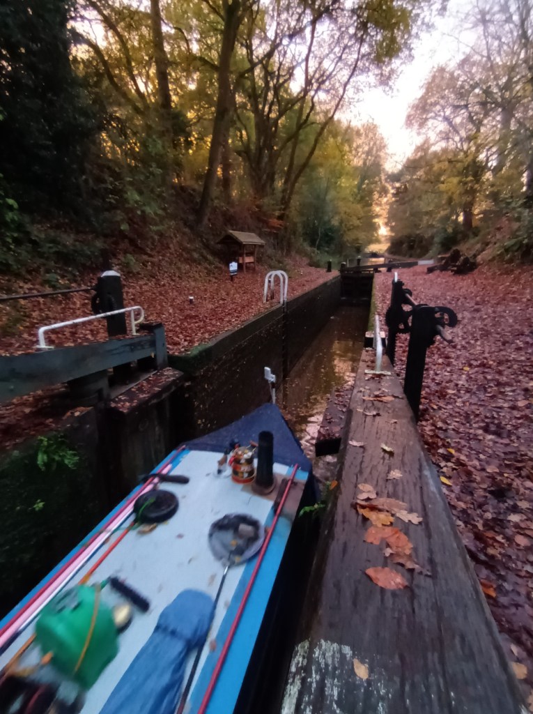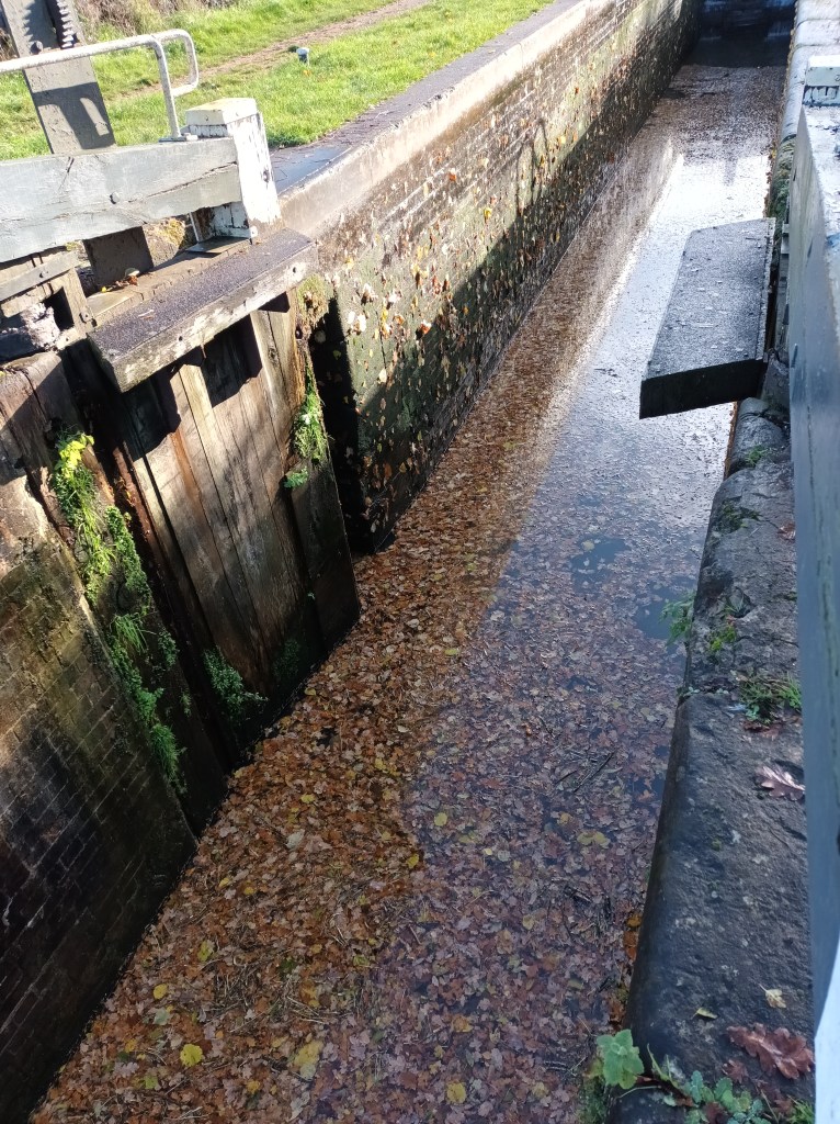 The shortest route to get there from where we were in dry dock is 44 miles but because of the winter closure programme we can’t use that way – we need to go the long way round, 65miles and 5 and three quarter furlongs through 43 locks and one tunnel to our destination. All that in autumn when leaves are falling from the trees to slow our progress by creating a thick leaf soup that clogs our prop, meaning regular pauses as we engage reverse to shake them off.