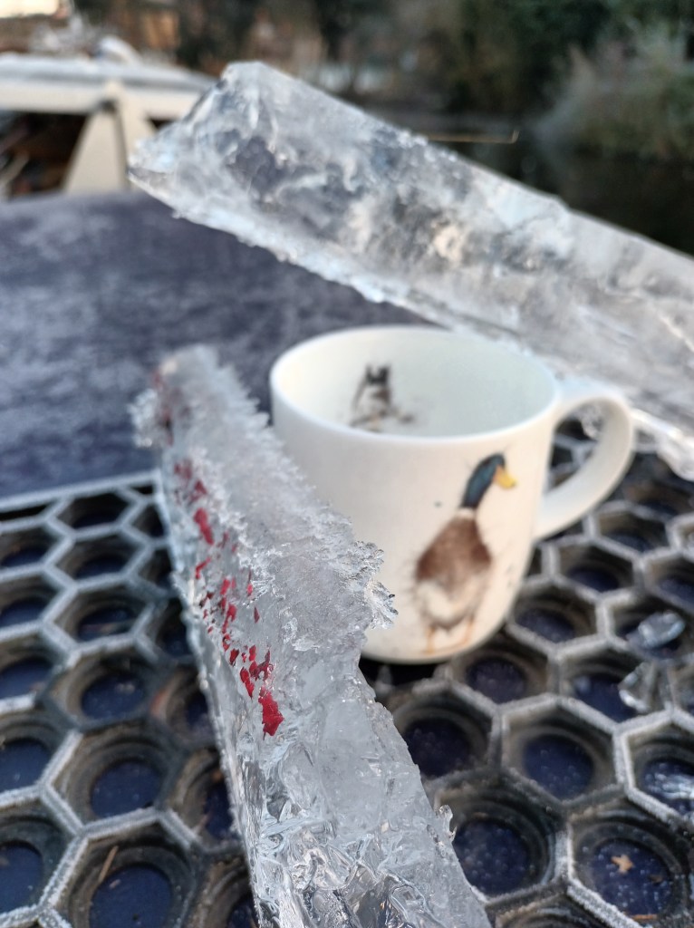 The boat feels different when iced in and we’re particularly aware of that at night when everything is quiet. It groans and creaks against the ice. As we move around on board the boat doesn’t rock as it usually does but stays oddly stationary. Other sounds also change. We’ve had the thud of icicles dropping onto our metal roof from trees above.