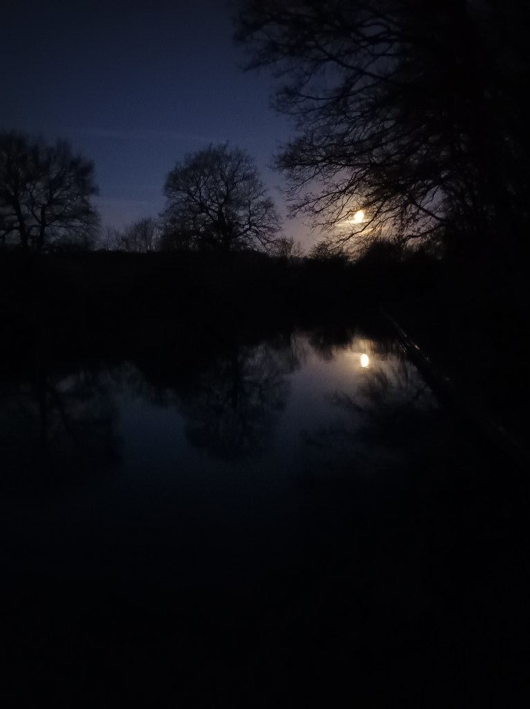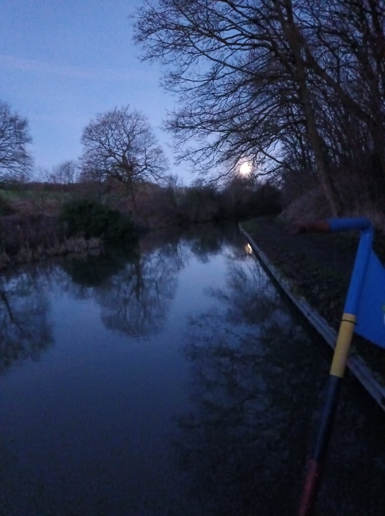 The barking of foxes and calls of owls in the woods beside us were the only sounds to be heard at night, and the moon the only light. Our original idea of a very early start to make the most of the time available to move before work meetings was delightfully delayed by the diurnal wobble. After the shortest day we think it’s going to become lighter but there’s a wobble for a week or two until things settle down. It was really apparent in the clear skies round the dark woods.