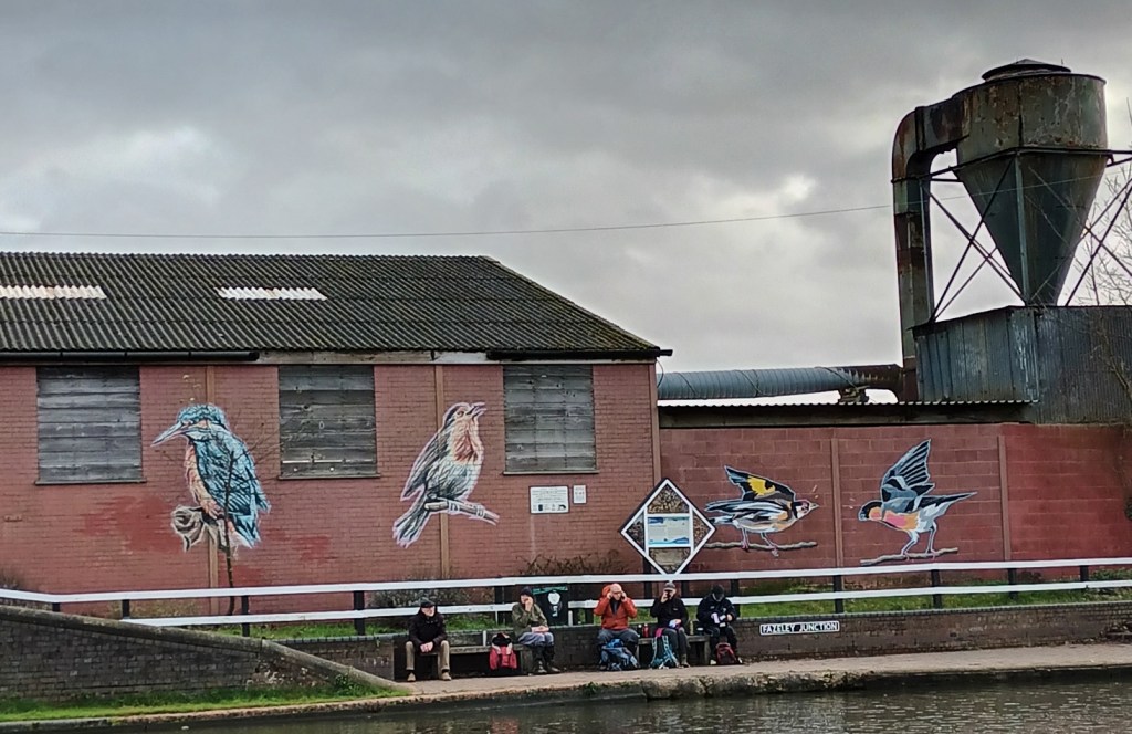By Fazeley junction we were back on the Coventry Canal, and from this approach it is possible to really enjoy Steve Edwards’s giant murals of a kingfisher and robin which he created in 2014 on the side of a timber yard. They’ve now been joined by a lively chaffinch and bullfinch created by artists from New Urban ERA UK.