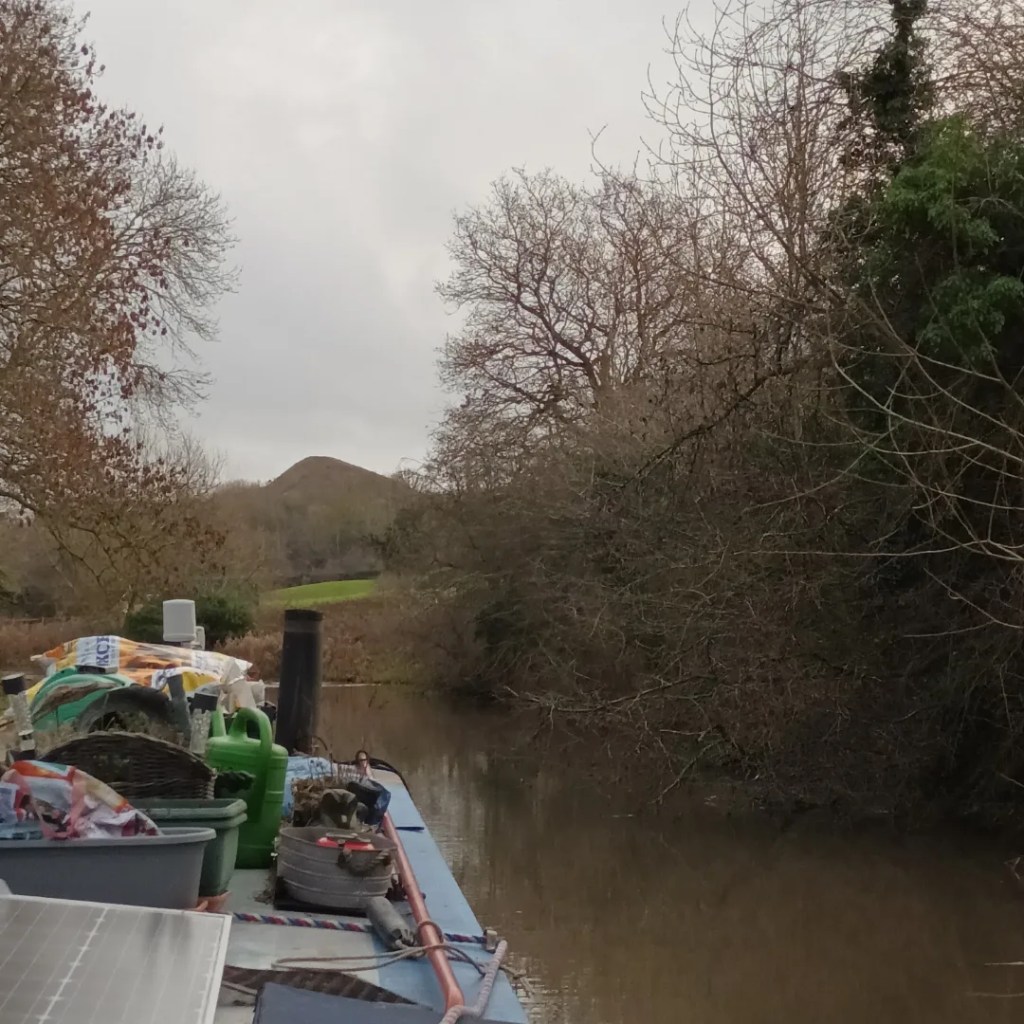 On then past many moored boats, some coldly lonely, others with puffing chimneys indicating inhabitants warm and cosy inside, to a blissful mooring spot in woodland below Mount Judd ( also known as the Nuneaton Nipple). This man made mountain of spoil from what was once Judkins’ quarry has settled to become a local landmark, and it’s certainly useful as a location guide.