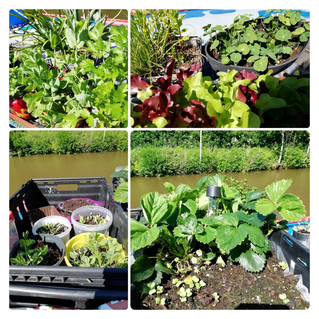 As rain pools around me (fortunately outside) I am planning for drought and empty coal trays for a productive roof garden again. It needs to be productive in a low growing sort of way – learned my lesson in the past with a hugely successful potato bag which grew like topsy. So well did it grow that we had to remove it from the roof because we could no longer see round it to navigate safely. It became a daily workout, moving it into the cratch, onto the towpath when we moored and back aboard before moving off.