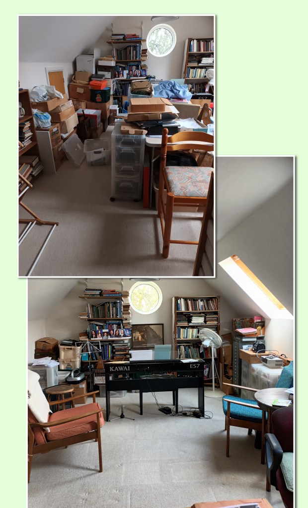 Weirdly most of what we disposed of came from employment, that fundamental around which our lives had revolved. Changing to live rather than work – working only when necessary changed our perspectives on the importance of associated papers, journals, books etc. Many were gifted, some papers shredded and others were recycled.