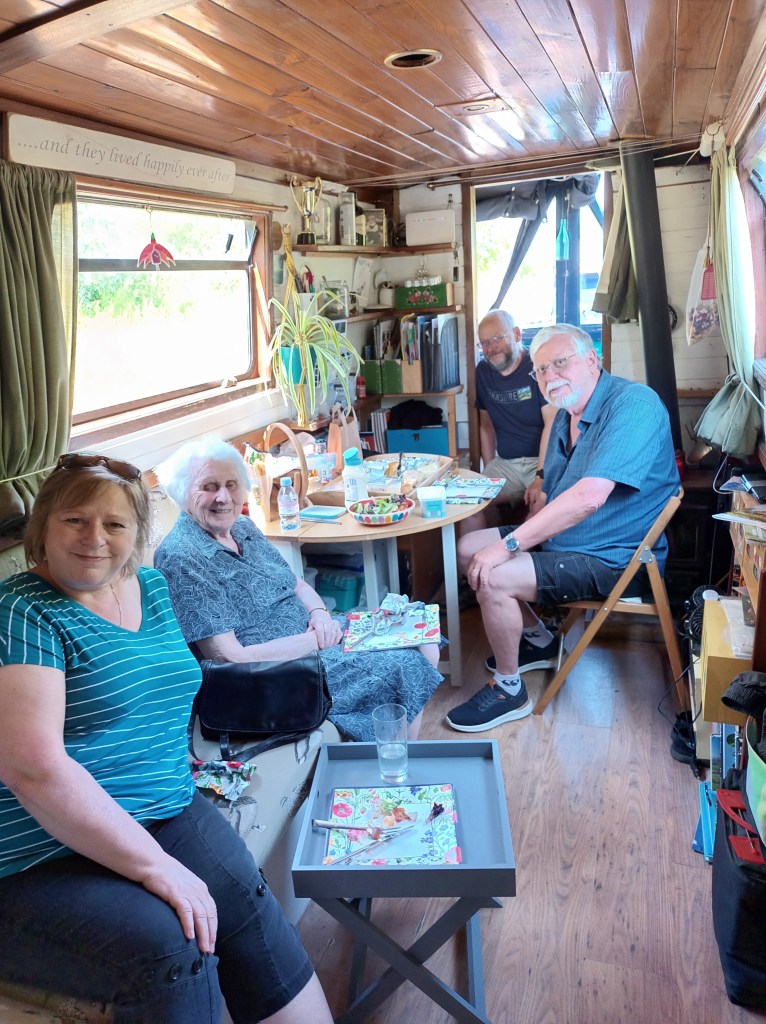 This week, we cruised part of the Leigh Branch together aboard nb Preaux. She generously sat inside at the start, leaving the bow seating for her daughter and son-in-law over from New Zealand, saying she’d been out in the cratch on a previous visit, and they should enjoy it as she had, but once one of them moved to the tiller, she was out there, seated in the sunshine. Ducks, ducklings, geese and goslings, two lone cygnets, hundreds of dragonflies and banded demoiselles – vivid turquoise flashes above the water, all entertained us. Like us, she was horrified by the amount of litter floating around, and I began the slow task of netting rubbish whilst she was with us and will continue that again this week.