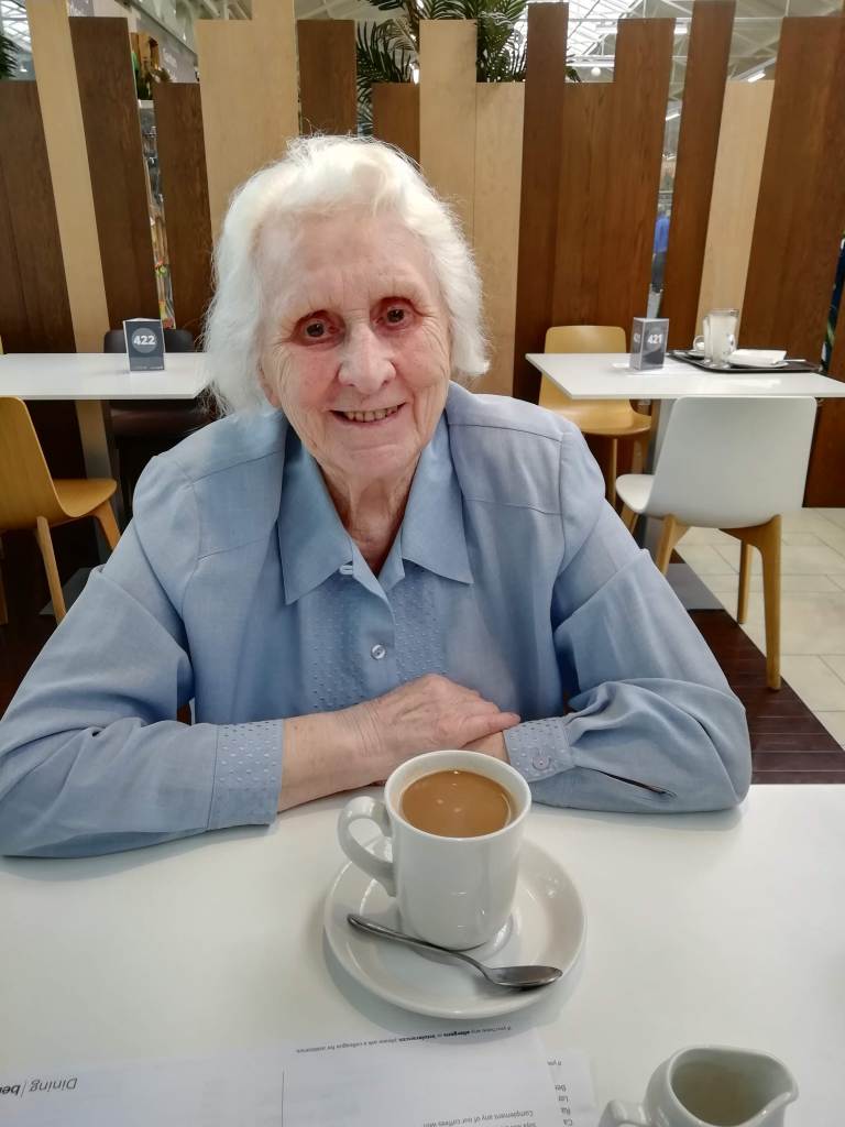 3.       Nothing stops her having a go in whatever way she can manage if she wants to do something. She longs for new legs particularly but that doesn’t stop her pushing her limits, and that’s a maxim we can all adopt whatever age, whatever our circumstances. This week one of her new experiences was coffee in a takeaway cup! [See first picture!]