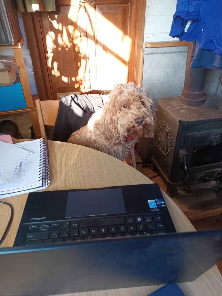 Monday started this week with mud, gloopy, boot-sucking, paw-encasing mud. Tuesday, I spent working at the computer toasting myself gently beside the stove, enjoying the sun streaming through the window beside me. On the odd occasions I moved from the computer to the kettle and back, Boatdog instantly chose to keep my seat warm (or pinch it as the case may be!).