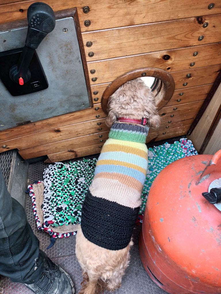 Noise in the marina has been a major issue for Boatdog. The bird scarers in surrounding fields terrified her. As a result she cowered outside her safe space of home and walks became a struggle for her (and us). Now she’s relaxing a bit although there are birds scarers a distance away, which we can still hear, and she does react, but we are reducing her terrors day by day. She enjoys travelling too and on cold days now sports a jumper I made her from leftover yarn.