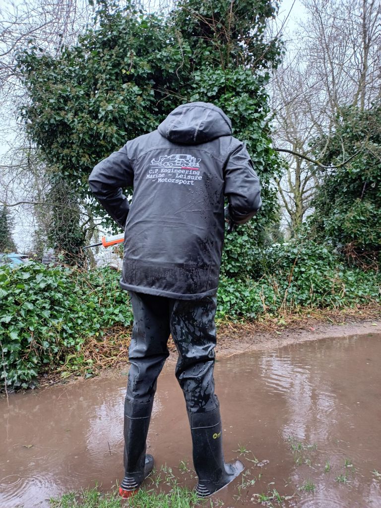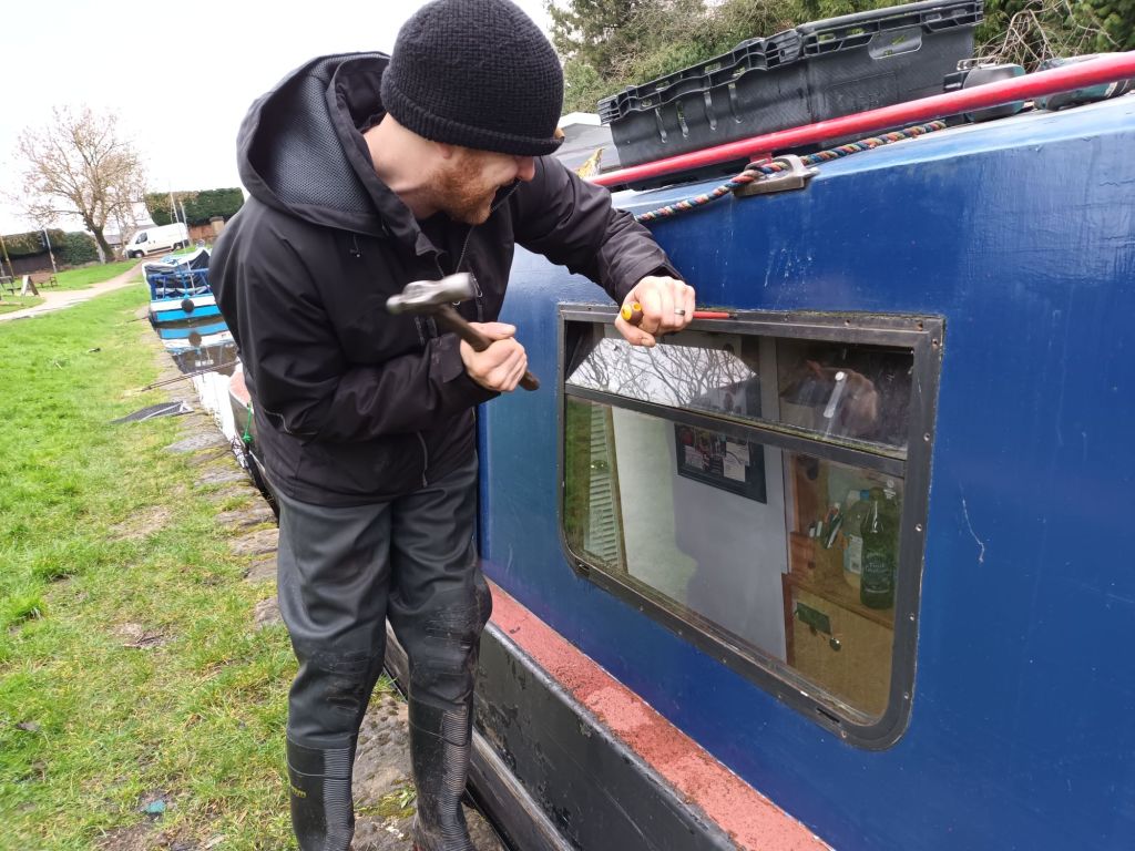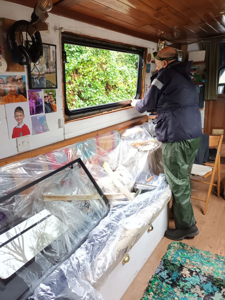 They sat overnight in a Derbyshire car park near the boat, and then on Thursday the highly recommended Callum came to install them. We couldn’t have chosen worse weather to be without windows! The rain started in the early hours of Thursday. It thundered unrelentingly on the roof, hammered against the old windows, and by the time Callum arrived (sensibly clad in waders) the towpath alongside the boat (and alongside the first lot of windows to be replaced) was under water.