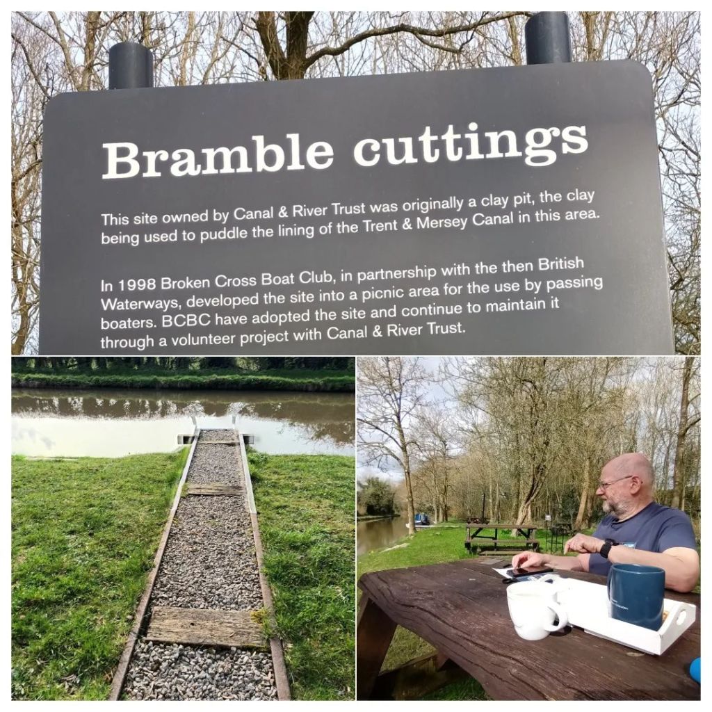 From Middlewich it was a short hop to Bramble Cutting, once the site of puddle clay extraction. That was the clay used to line the canal. Now it provides an offside peaceful mooring with picnic tables and the tracks still evident that the clay carts used to be rolled down to waiting boats. We’ve passed numerous times and never managed to moor here so when we saw a space…