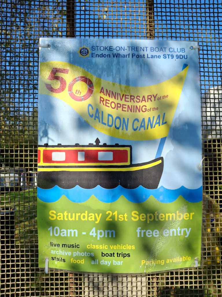 So this year marks 50 years since the Caldon Canal reopened due to the efforts of so many people, and today there is a major celebration event which we will be attending at the Stoke-on-Trent boat club at Endon on the canal itself. It is due to them that we along with kingfishers, green woodpeckers, moorhens, ducks, walkers, fishermen, runners, cyclists, and other boaters can enjoy this beautiful waterway. We want to support and salute their efforts by using the waterway, and joining in the celebrations.