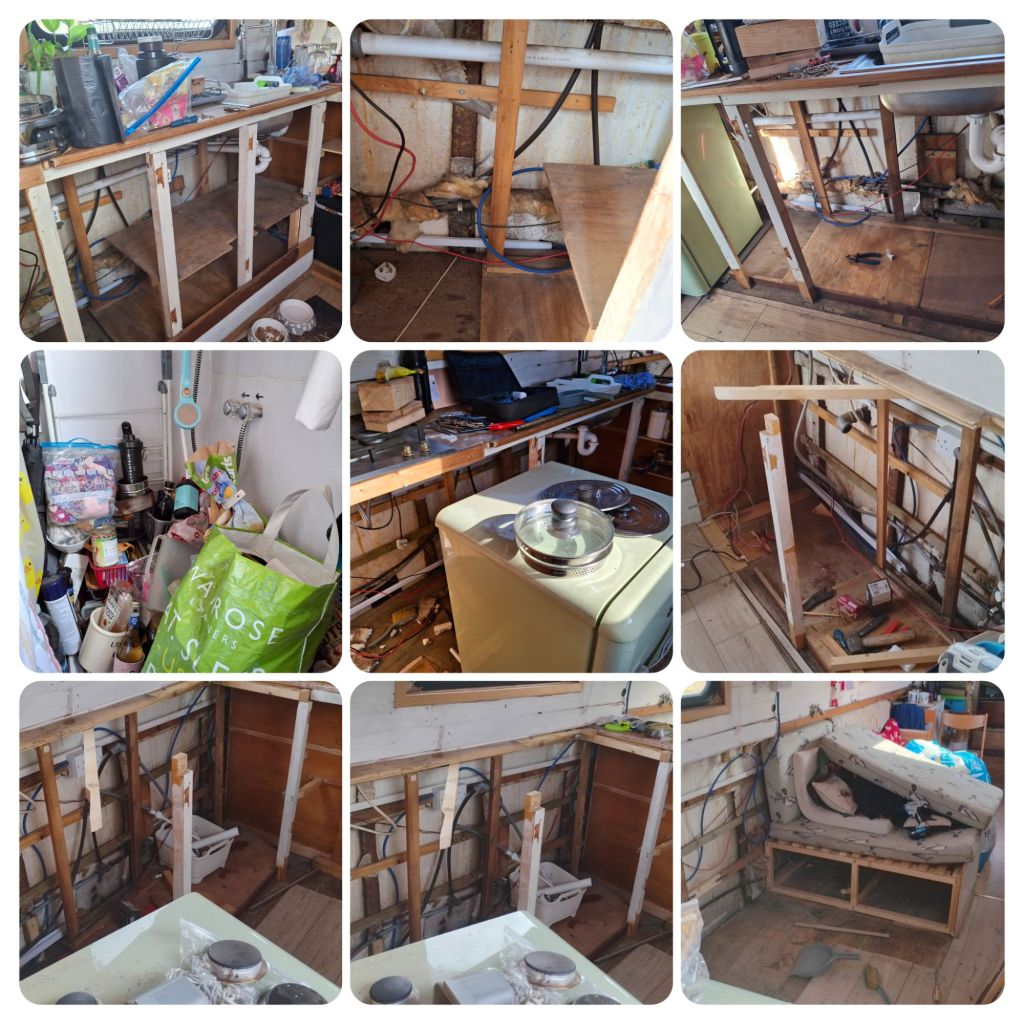 It’s also been necessary to rebalance things. Under the old floor were kerbstones being used as ballast. Replacing the kitchen is going to create more weight, so 4 of those have had to move. That’s around 160kgs taken from one side of the boat, so as I write this, she is listing by approximately 4 degrees. That doesn’t sound much, but it feels like a lot more.