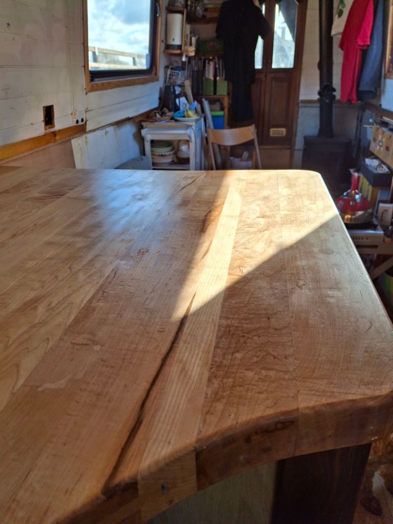 The sun (and there has been some this week between showers and hail), lights a vast expanse of beech which is being nurtured daily. Painstakingly pampered, sanded, and oiled. Once a day for the first week, once a week for the next month, once a month for the next year and once a year after that. I think I’ve got that right!