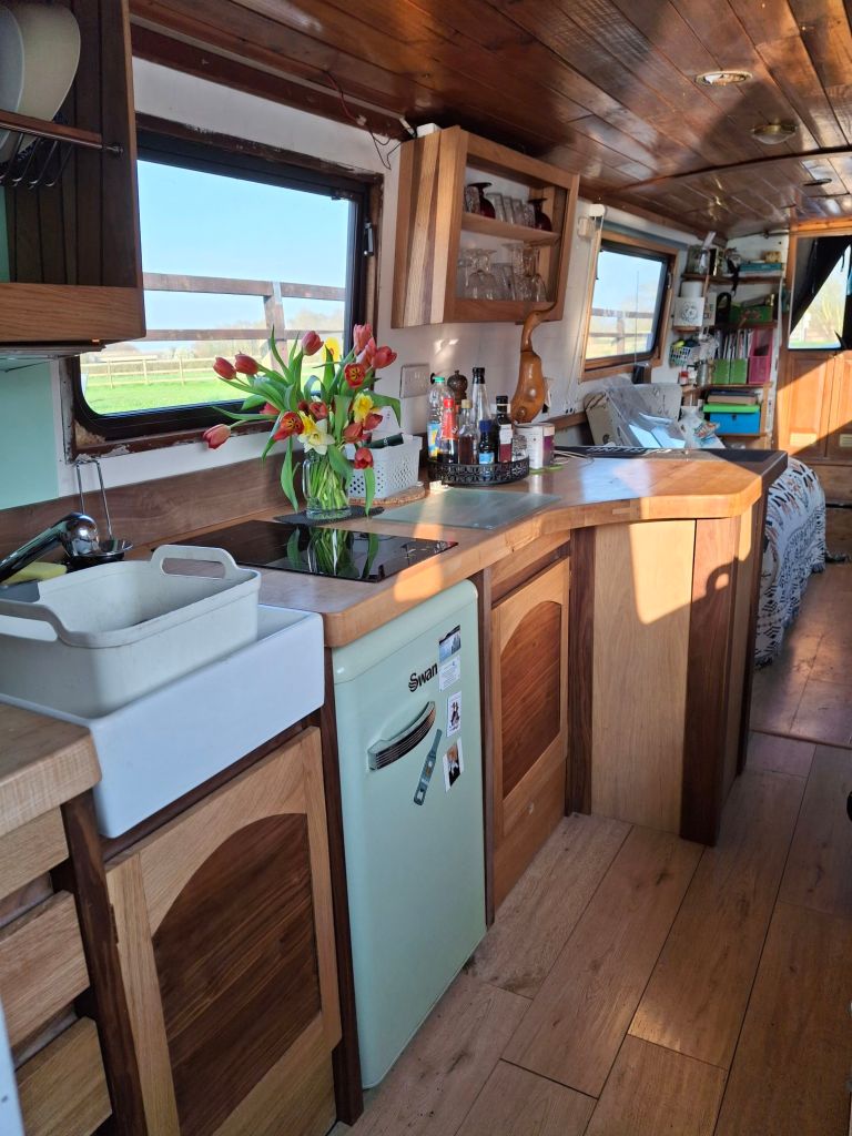 It is evident that this tactile, smooth, and natural crafted kitchen it is already changing how we feel, how we live, and how much we enjoy our floating home. I’m sitting writing this whilst stroking the beautiful warmth and grain of the substantial worktop on which my laptop is resting. I defy anyone to come aboard and not stroke the curves of the solid beech worktop, to trace the shapes and patterns, the whorls and waves within the wood, that tell its stories.