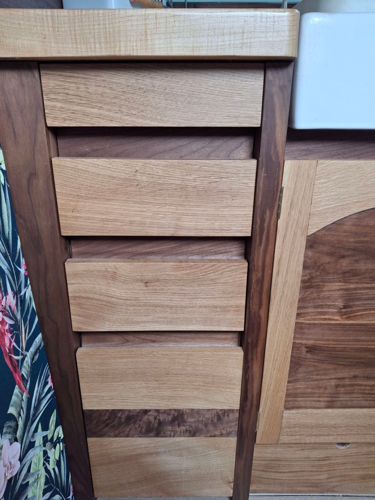 Cupboards have been designed to cope with the sloping tumblehome od our nartowboat and to specifically fit particular elements important to our life, like a beautiful hand cranked sewing machine (thank you Roena) and a (new) air fryer. Drawers are designed without intrusive handles. The plinth is full of drawers, and there are no less than 7 drawers in this exquisite unit.