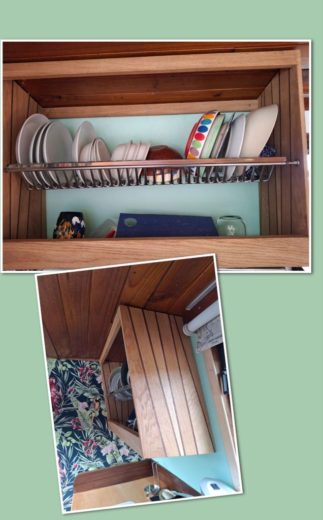 Every day, I find something different, a different pattern, a new addition to how we live because of this remarkable piece of craftsmanship. We have the benefit that this beautiful kitchen was built for us by a young man who is a master of his craft, and he’s also a boater. As such, he understands the need to maximise space, making the most of every centimetre on the boat and of the beautiful wood he uses. There are elements that are nothing short of remarkable. Above the sink hangs a crafted draining cupboard that is nothing short of art. It holds our crockery and washing up, doing away with the need to have an unattractive metal or plastic drainer taking up space and breaking up the beauty of our sea of beech worktop.