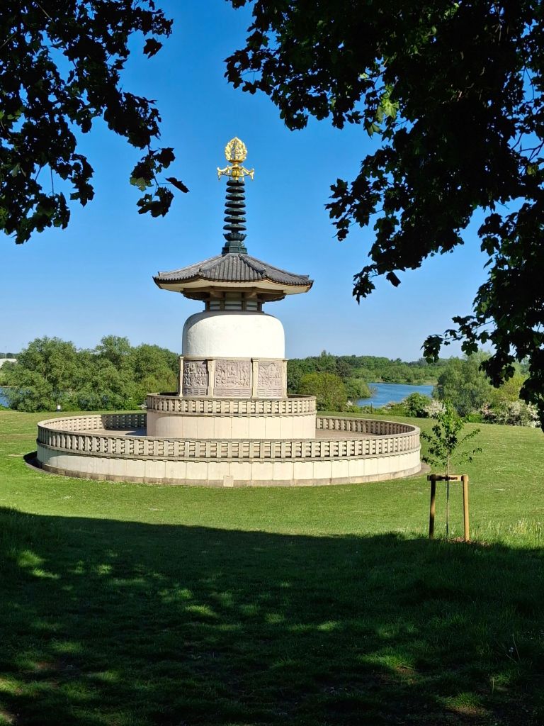 The Peace Pagoda in Milton Keynes is just a short walk from our current mooring. A thousand cherry trees and cedars are planted on the hill around the Pagoda in remembrance of victims of all wars.