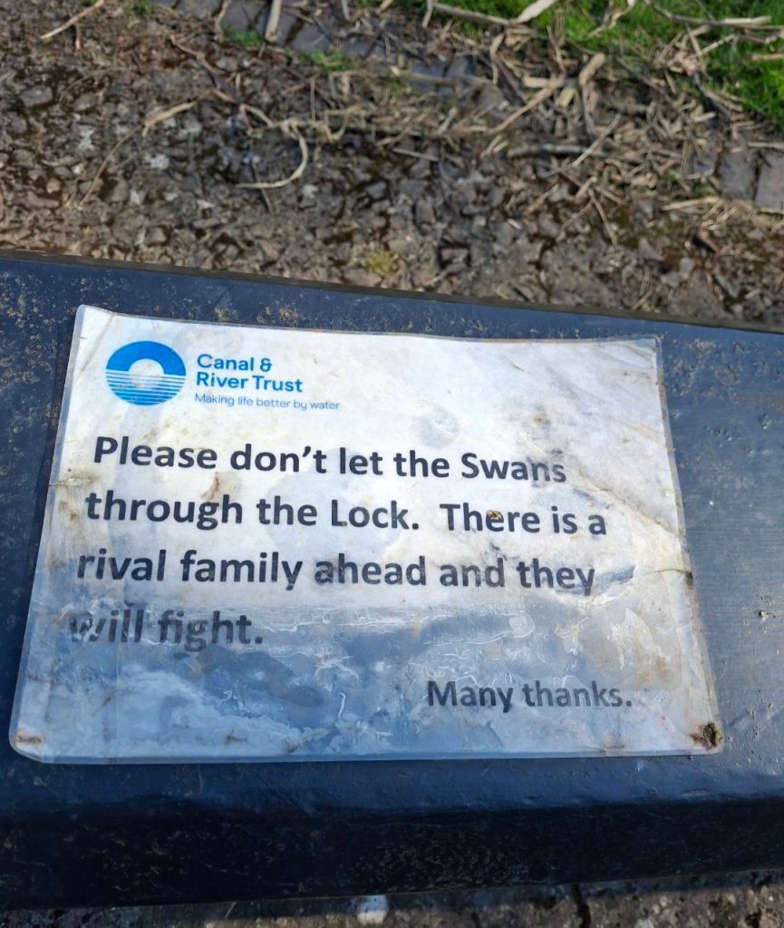 The Chase is no light-hearted farewell. It can be ferocious, and as boaters we need to be very aware of swans at this time. We can end up dodging warring factions, and even having to intervene to save life. Young pairs will be looking for territory and established males are looking to protect their patch, as well as shooing away their own offspring in a far from gentle manner. It can be deadly if two warring swans end up trapped together in a lock by accident. We know of particular places where this can be an issue – on the Leicester line and on the Erewash especially. Sometimes there will be notices on lock gates warning boaters not to let swans into the locks.