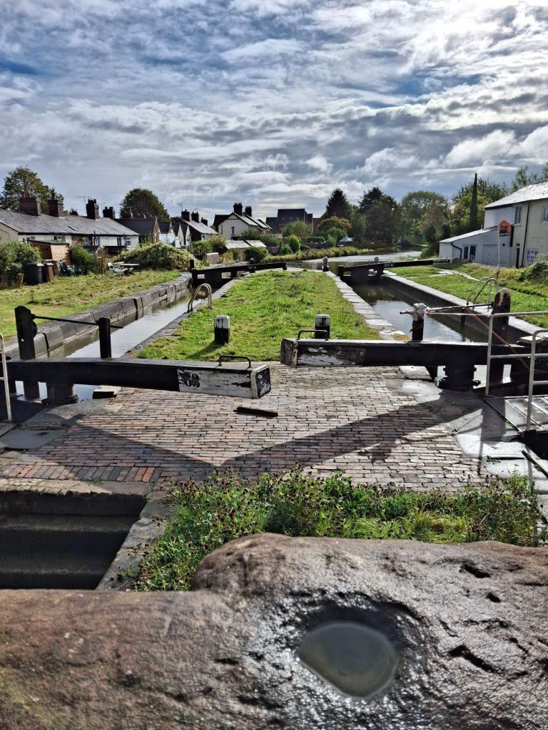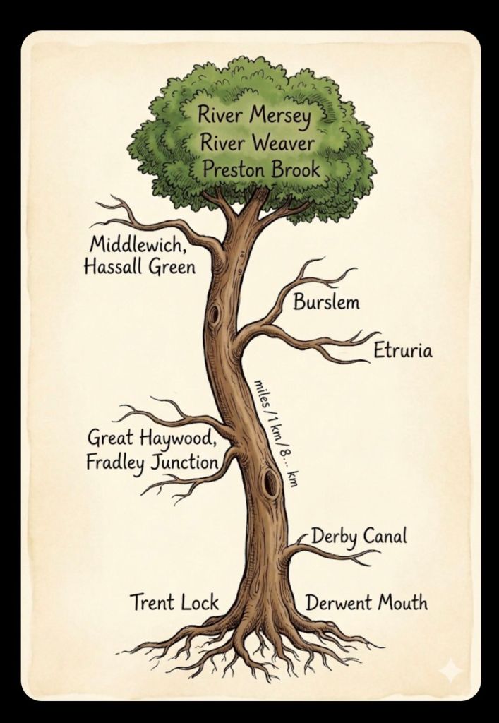 The Burslem branch is now closed but that appeared for carriers before Hardings Wood and the branching off of the waterway to the Macclesfield Canal – from when silk and lace were transported. Up through fields and saltworks to Middlewich where the Shropshire Union Canal branches off, and on to Anderton where in 1875 the Anderton Boat Lift was opened to transport boats 50feet down to the River Weaver (and back again). In Brindley’s day boats reached the River Weaver which led to the overarching trunk canopy of the River Mersey via the Bridgwater Canal at Preston Brook and Runcorn.