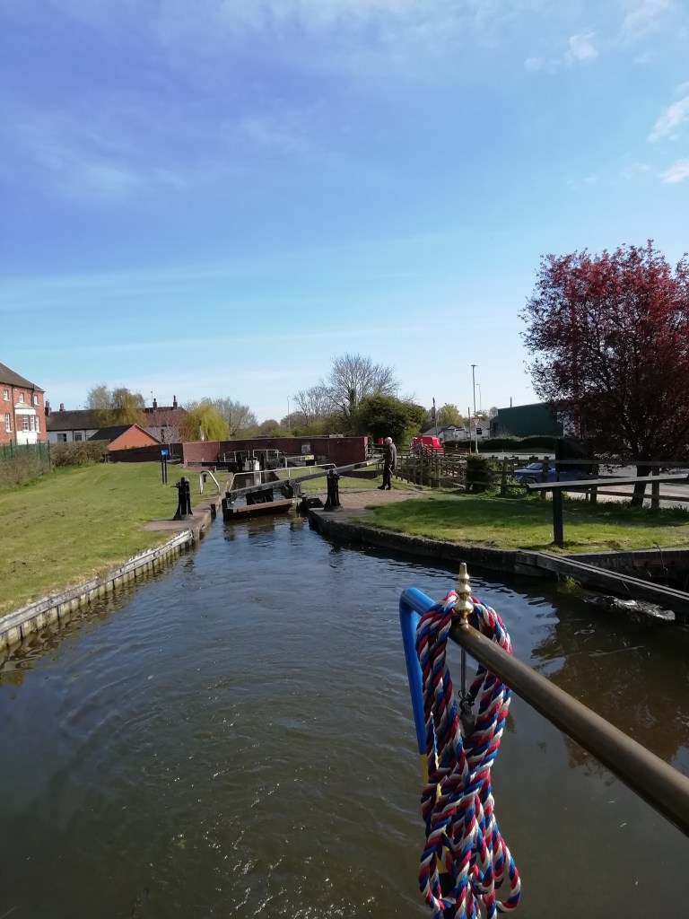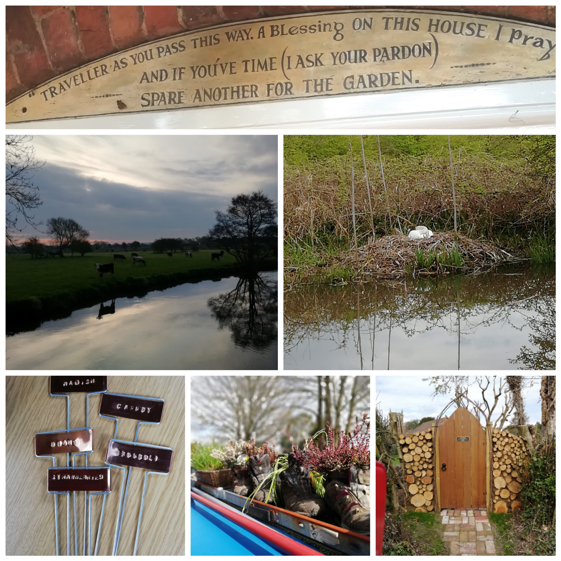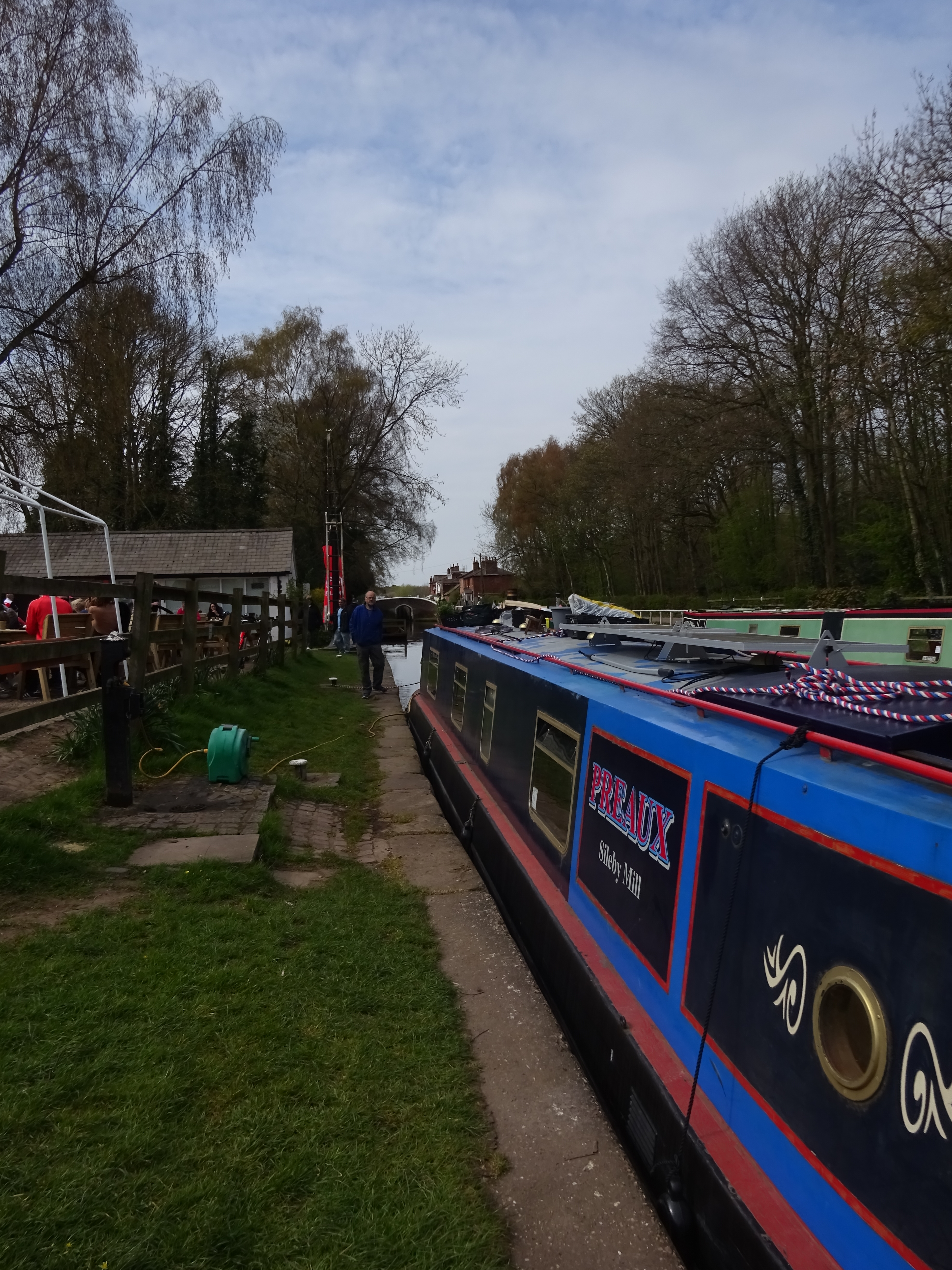 This year I am acutely aware of the accelerating pace of Spring. Every day it seems new buds appear, new flowers arrive to show off their colours and scents. After the busy bustle of Fradley Junction where we pulled in by the Laughing Duck cafe to fill up at the slowest water point ever, and after emptying all the waste, we’d earned a pint outside the Mucky Duck (aka The Swan). Narrowboat life makes you very aware of your water consumption and waste production – you can’t help it!