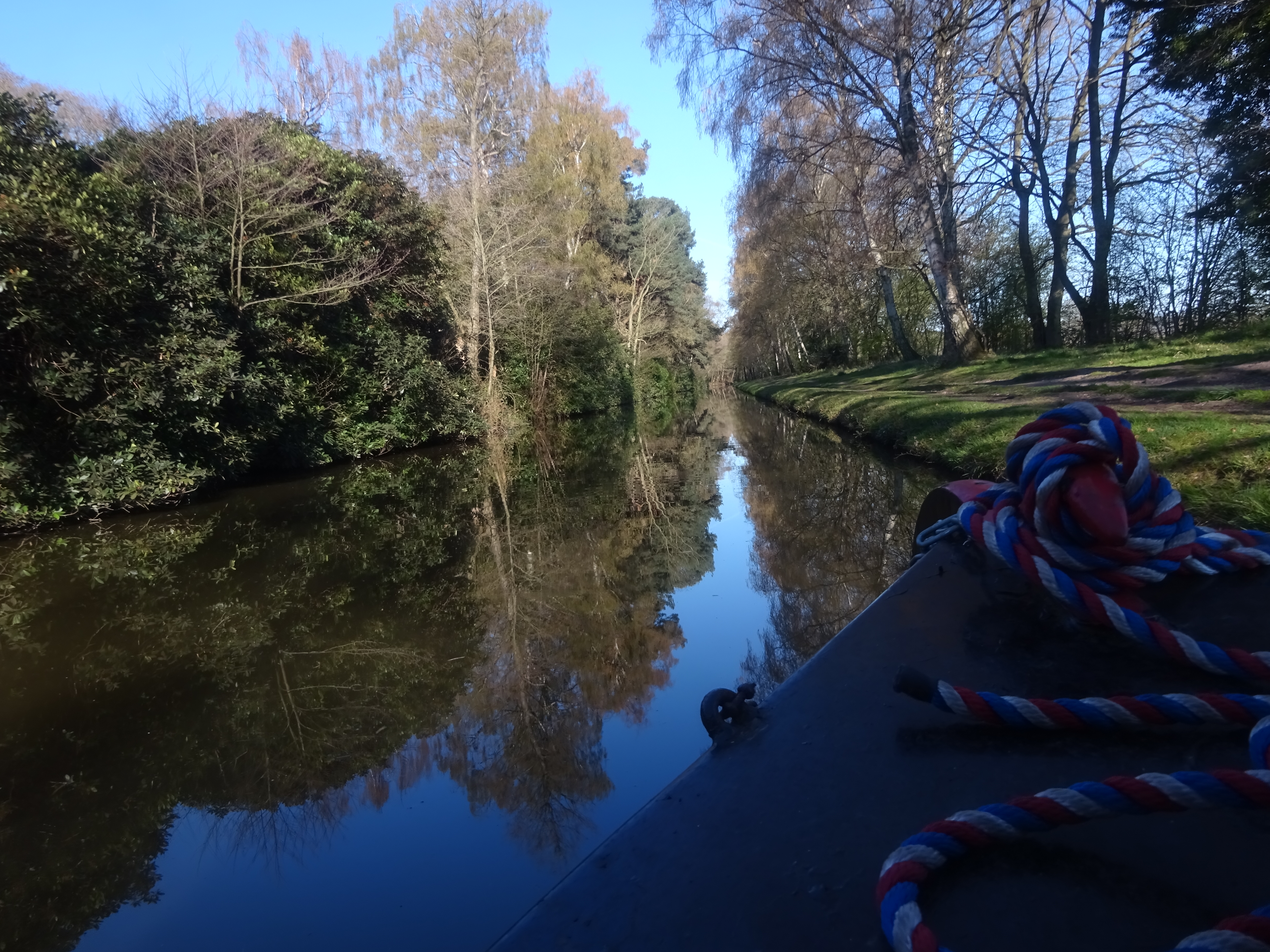 Further on just round the most southerly point of the Trent and Mersey Canal at Wood End Lock it was a huge contrast and delight to find a tranquil mooring spot opposite Slaish. This woodland of deciduous trees, packed with squirrels, foxes and birds will be amazingly different when the huge rhododendrons come into flower. Our only company were nesting rooks and rabbits. The bank alongside the boat was covered in tiny purple violets.